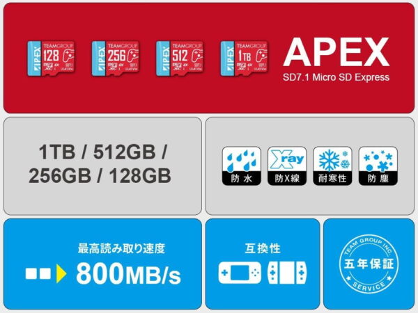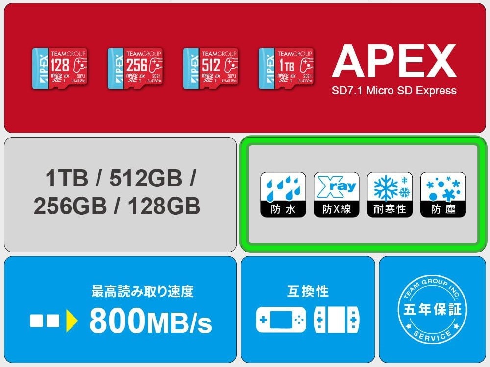 「TEAMGROUP APEX microSD Express」は防水性、防塵性など5種類の耐久性能が公式スペックとして記載されています。