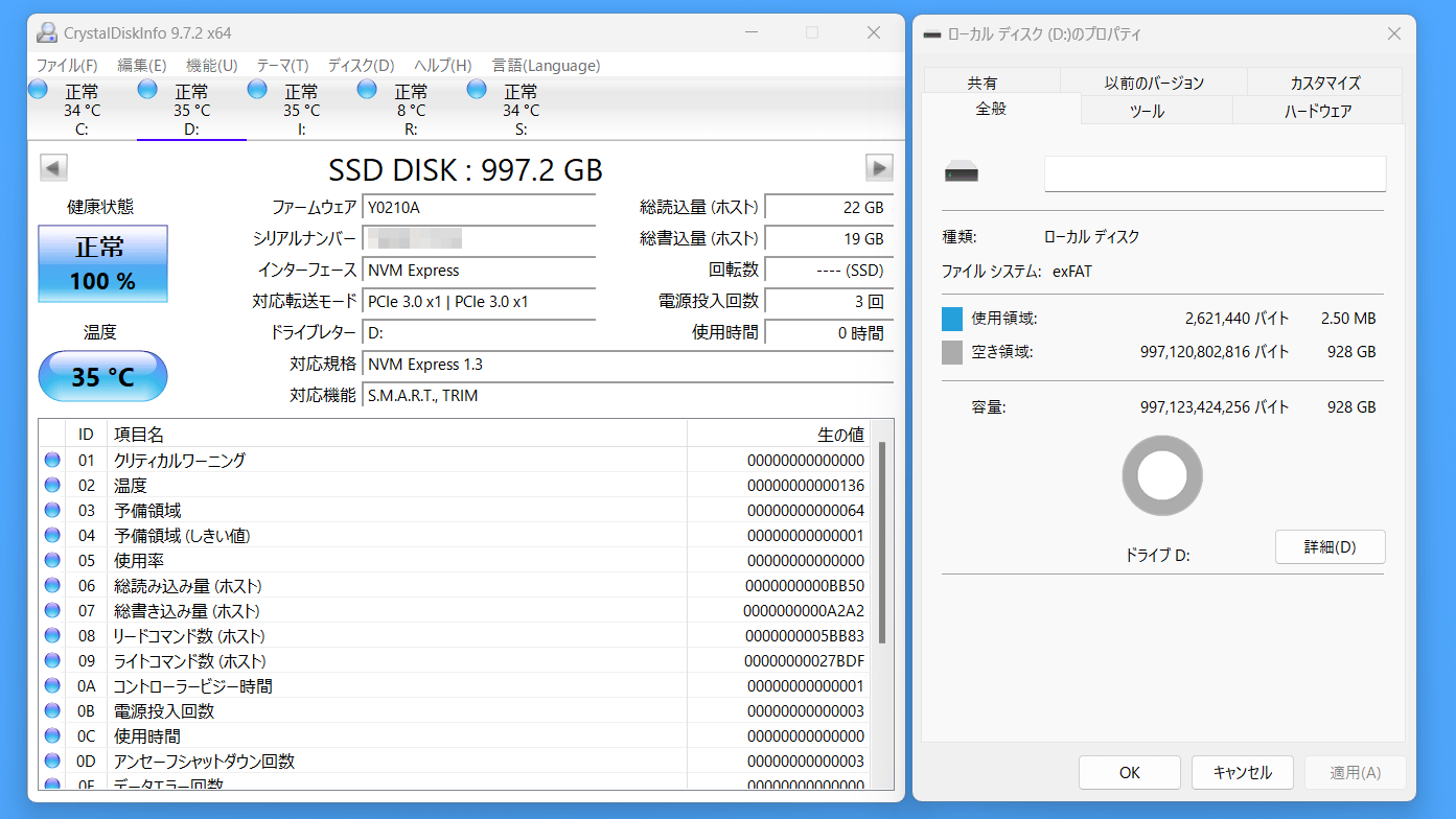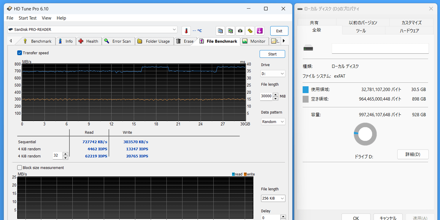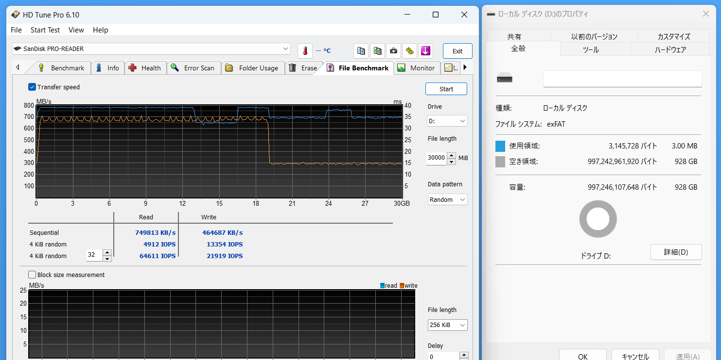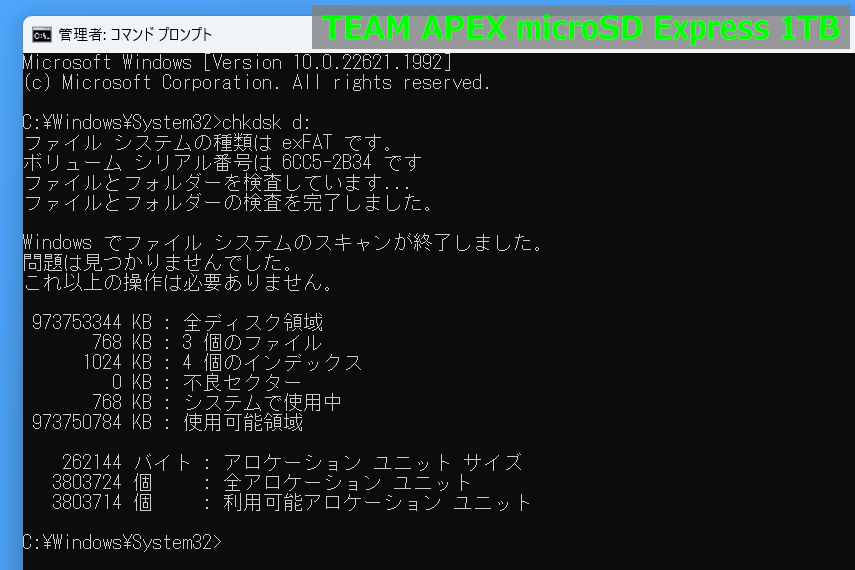 「TEAMGROUP APEX microSD Express 1TB」のexFATボリュームをWindows 11上で作成したところ、空き容量は928GBでした。