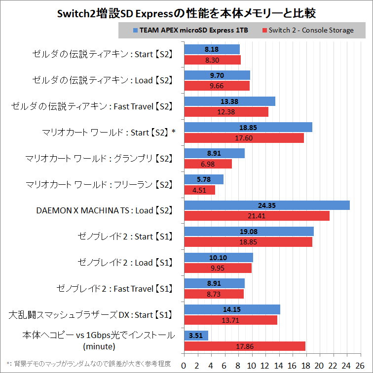 「TEAMGROUP APEX microSD Express 1TB」をSwitch 2の増設ストレージとして使用した時のゲームロードやコピーインストールの性能を本体内蔵メモリーと比較すると次のようになっています。