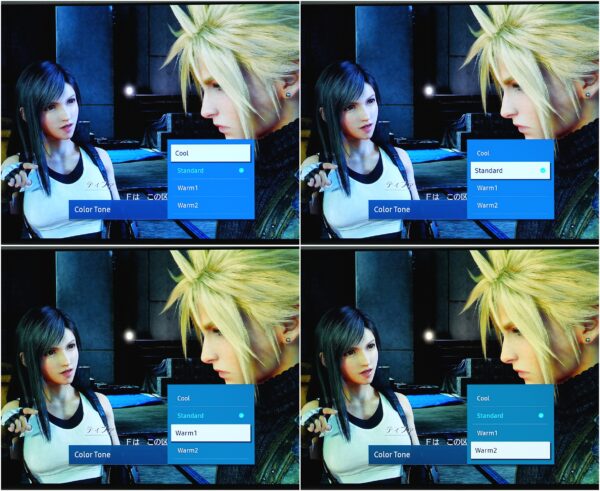 下画像で言うと本体付属ディスプレイは右上のStandardくらいの色味で、そこからTVモードでは左下のWarm 1の色味に切り替わります。スマホの画面も基本的に寒色寄りのチューニングなのでなおさらです。