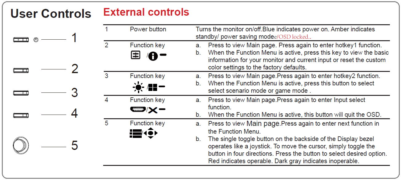 5つのボタン(うち1つは操作スティック)の機能は上から順に、パワースイッチ、ショートカットキー1、ショートカットキー2、入力セレクトボタン、操作スティックとなっています。