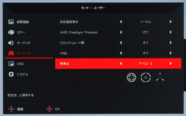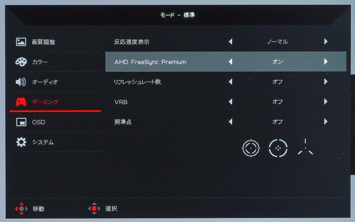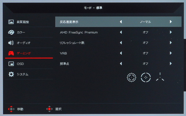 ゲーミングのメニューではその他にも、リフレッシュレートの表示や照準点の表示などゲームのプレイに便利な機能の設定が行えます。照準点のカラーが白色のみなのは少し不便かもしれません。