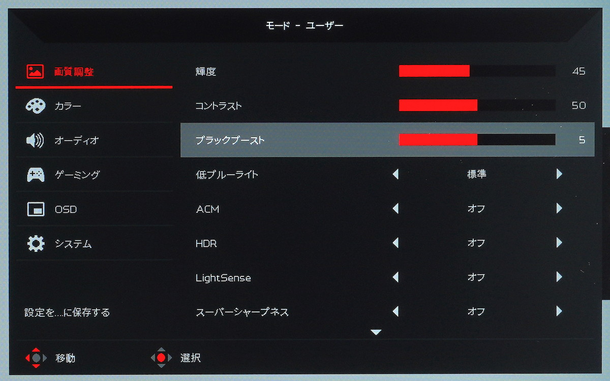 「Acer Nitro XV282K KV」では、「アクション」「レース」「スポーツ」「ユーザー設定」「標準」「エコ」「グラフィック」「HDR」の8つの画質モードが用意されており、初期設定では「標準」が選択されています。「ユーザー設定」「アクション」「レース」「スポーツ」は設定内容をユーザーが任意に変更できます。
