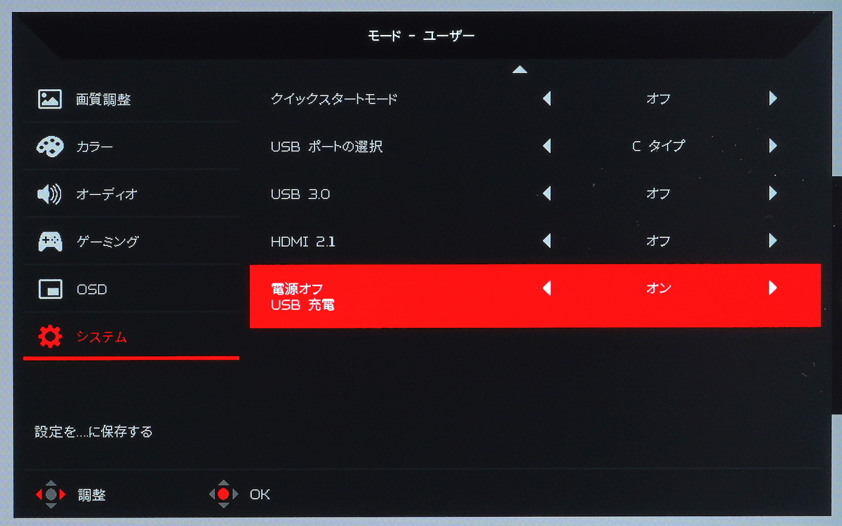 一部のモニタではモニタ電源がオフやスリープの時にUSBハブ端子への電力供給が止まる仕様になっていることがありますが、「Acer Nitro XV282K KV」では画面スリープ中も電力出力を行う設定が用意されています。