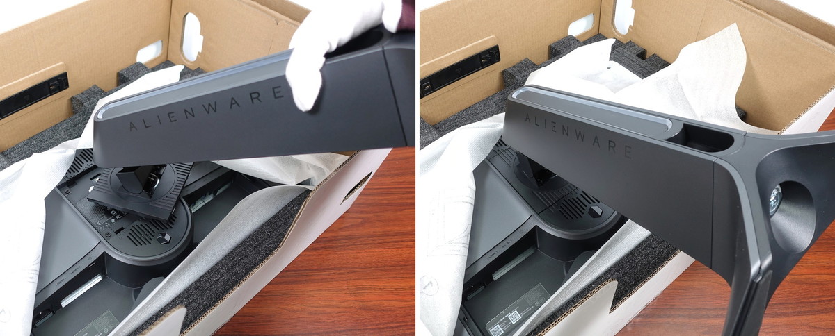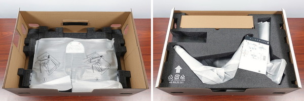 モニタのパッケージというと、天面を開いて抜き出す梱包形式が多いですが、「Alienware 27 AW2720HF」は天面と底面に2か所ずつのプラスチック製固定器具を外して、広い面の蓋を開くという構造になっていました。蓋を開くと液晶モニタ本体や付属品が収められたスポンジ製スペーサーが現れます。