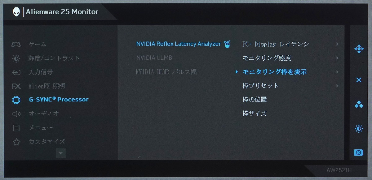 「Alienware AW2521H」でシステム遅延測定機能NVIDIA Reflex Latency Analyzerを使用する方法について説明していきます。まずモニタ側の設定として、OSD設定のG-Sync ProcessorにNVIDIA Reflex Latency Analyzerに関する設定項目が配置されています。