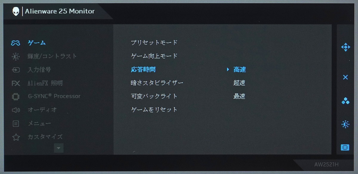 一般にオーバードライブと呼ばれる応答速度を調整する機能は、「Alienware AW2521H」は「応答速度」の名前で配置されています。オーバードライブ補正の強度を高速/超速/最速の3段階で設定ができて、標準設定は高速になっています。