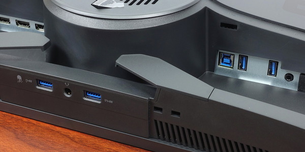 背面の右側にはUSB3.0アップストリーム端子、2基のUSB3.0ダウンストリーム端子、さらにモニタ底面に2基のUSB3.0ダウンストリーム端が設置されており、PCとアップストリーム端子を接続することによって、4基のUSBハブ端子として使用できます。