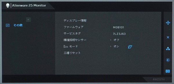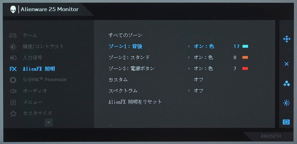 「Alienware AW2521H」のOSDメニューには大きく分けて、「ゲーム」「輝度/コントラスト」「入力信号」「AlienFX照明」「G-Sync Processor」「オーディオ」「メニュー」「カスタマイズ」「その他」の9つの項目が用意されています。