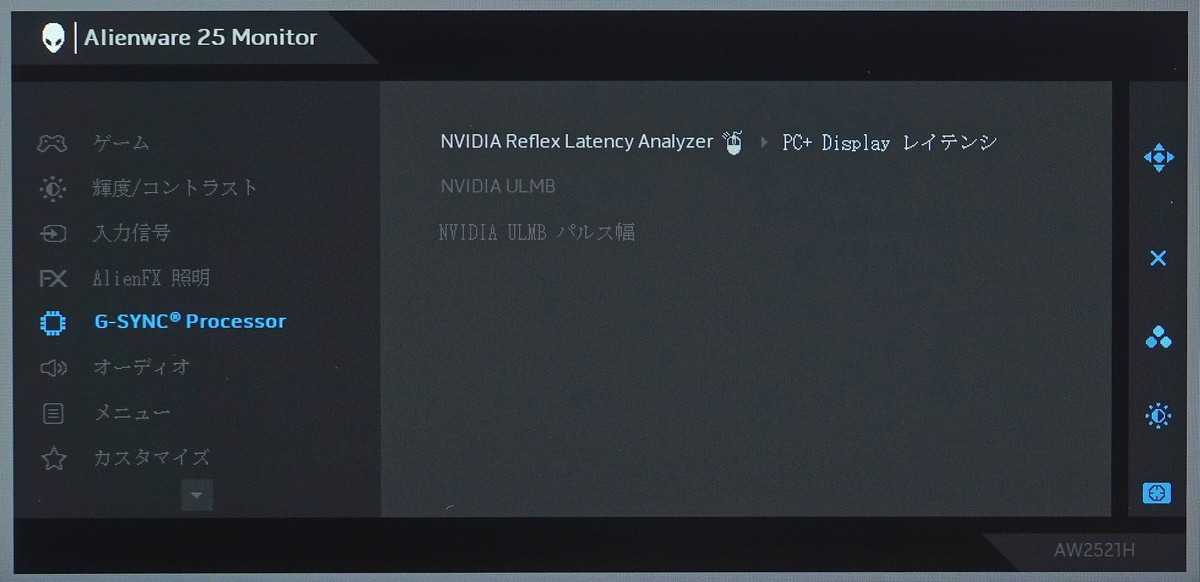 「Alienware AW2521H」はNVIDIA G-Syncモジュールによってサポートされるシステム遅延測定機能「NVIDIA Reflex Latency Analyzer」に対応しています。