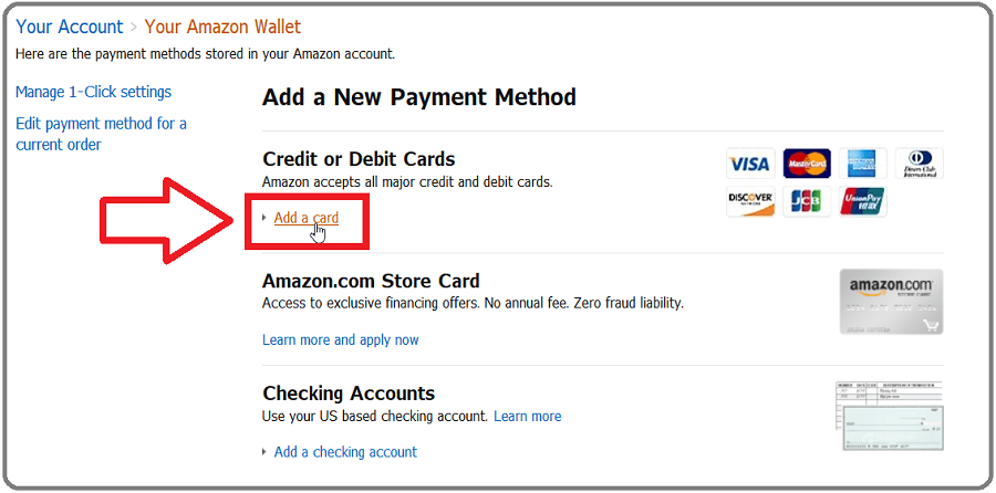 次は支払い方法となるクレジットカードを登録します。住所登録と同様にアカウント管理メニューを開き、今度は「Add a Credit or Debit Card」を選択します。