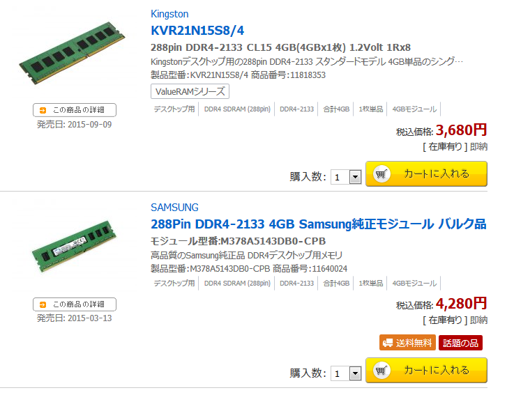 DDR4メモリは現在安いものなら4G1枚あたり3000~4000円程度の相場で購入可能になっています。