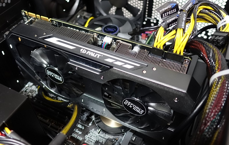 グラフィックボードはGTX 1080の国内ではドスパラ独占取り扱いとなっているPalit製オリファンモデル「GTX 1080 8GB JetStream (NEB1080S15P2-1040J)」です。3スロット占有の大型GPUクーラーを搭載したモデルになっています。補助電源はGTX 1080のリファレンスより多い8PIN+6PINが使用されています。のちほど詳細に解説しますが、同グラフィックボードは3スロット占有の大型クーラーを搭載しているため静音性能・冷却性能がかなり高いです。