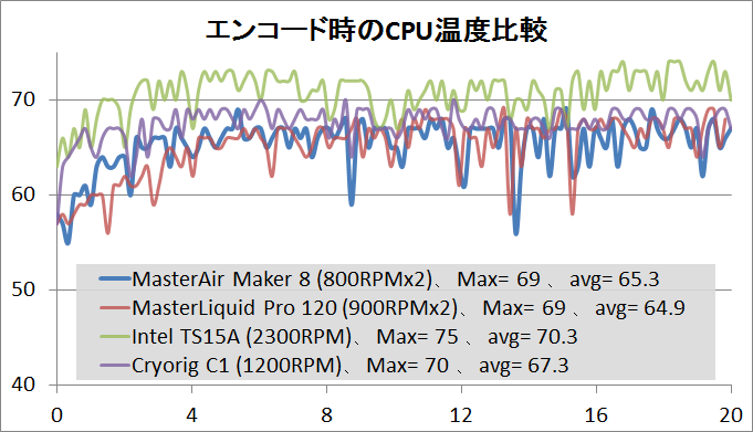 エンコード中CPU温度のCPUクーラー別比較は次のようになりました。