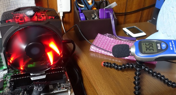 サウンドレベルメーター(騒音計)を使用してファンノイズをCPUクーラー別で比較しました。騒音計の収音部分とノイズ発生部分との距離が15cm程度になる位置で測定を行っています。簡易水冷の場合はラジエーターとポンプ両方からの距離が15cm程度になるように設置しています。