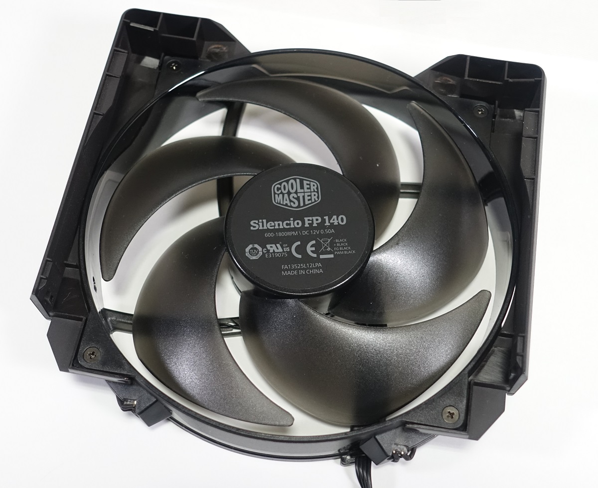 冷却ファンの型番は「CoolerMaster Silencio FP 140」で、PWM速度調整に対応し、600~1800RPMで動作する静音ファンです。低回転でも風量と静圧を稼げるようにファンブレードの反りを大きくする構造です。ファンブレードの数を5枚と少なくすることでファンノイズの主要因である風切り音を抑制しています。ループダイナミック・ベアリングという軸が採用されており耐久性 160,000時間(MTBF/理論値)の高耐久ファンでもあります。