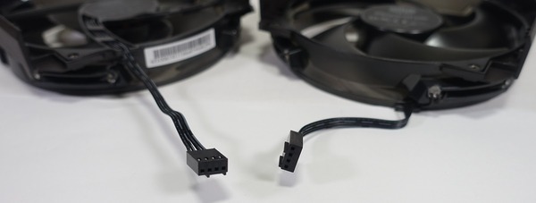 付属の延長ケーブルによる使用が想定されているので付属冷却ファンから延びるケーブルは100mm以下と短くなっており、どちらもPWM対応の4PINファン端子です。