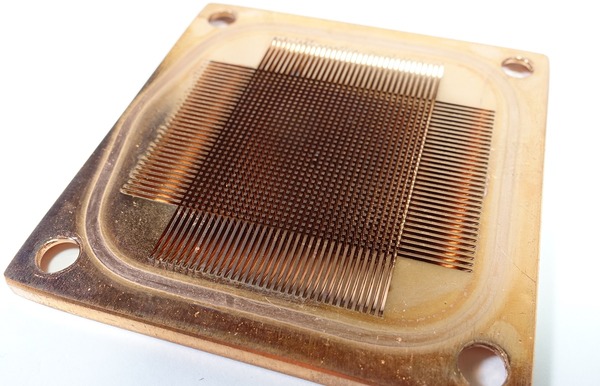 INポートからすぐのところにマイクロフィンへの流入を絞るジェット構造が構築されており、流速を速くすることでマイクロフィンからクーラントへの熱交換効率を高めています。
