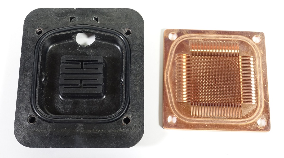 水冷ブロックを分解すると中の構造は次のようになっていました。構造自体は簡素ながらベース部分のマイクロフィンへの水路の入り口が細くなっているジェット構造も採用されていました。