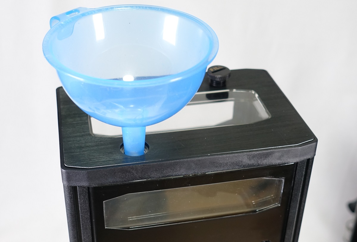 漏斗からクーラントを注入していきます。クーラント注入の様子を動画にしました。最初はポンプの電源を切ったままでクーラントを注いでいき、リザーバーの水面が上がったまま下がらなくなってきたら電源を入れます。