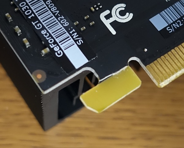 GT 730は電気信号的にはPCI-E2.0x8接続なのでASUSのファンレスGT 730では物理的なPCI-E端子もそれに合わせて設計されていましたが、MSI GT 1030 2GH LP OCはPCI-E3.0x4接続に対してPCI-E端子はx16サイズまで伸びており金属端子も実装されています。