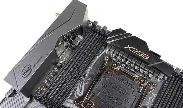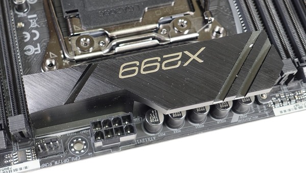 リアI/Oカバーは特徴の少ない簡素なデザインです。ヘアライン入りアルミニウムのVRM電源ヒートシンクはクールな趣ですが同時に金色のX299の刻印が豪華さも演出しています。