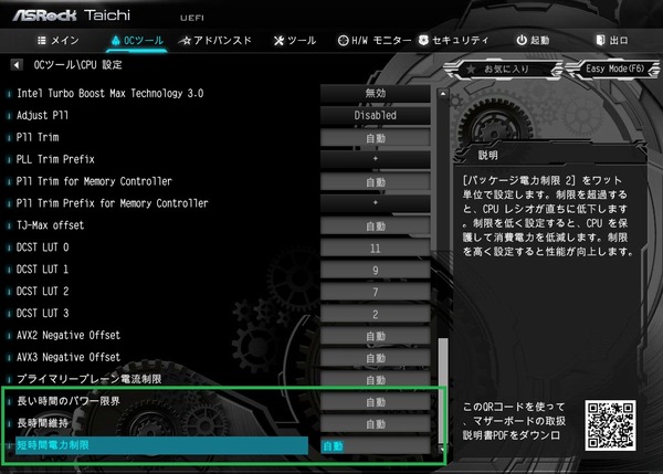 またCPU設定の下の方には「短時間電力制限」「長時間電力制限」という2つの電力制限機能があり、電力制限がかかる閾値(単位はW)と電力制限がかかるまでの時間を設定できます。電力制限がかかるとその指定電力内に収まるようにコアクロックに制限がかかります。デフォルトの状態では「Auto」になっていますが、ASRock X299 Taichiではパワーリミットが掛からないように勝手に設定してくれるので放置でも問題ありません。基本的に一定消費電力以内に収めるための省電力機能(+若干のシステム保護機能)と考えてください。