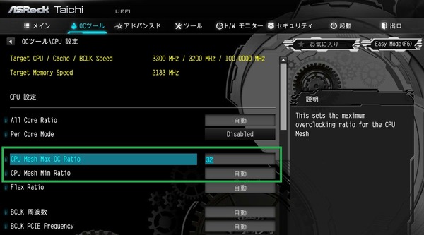 キャッシュ動作倍率にあたる「メッシュ動作倍率(CPU Mesh Max OC Ratio)」を変更可能です。CPUコアクロック同様にベースクロックに対する動作倍率でメッシュの動作周波数を設定できます。