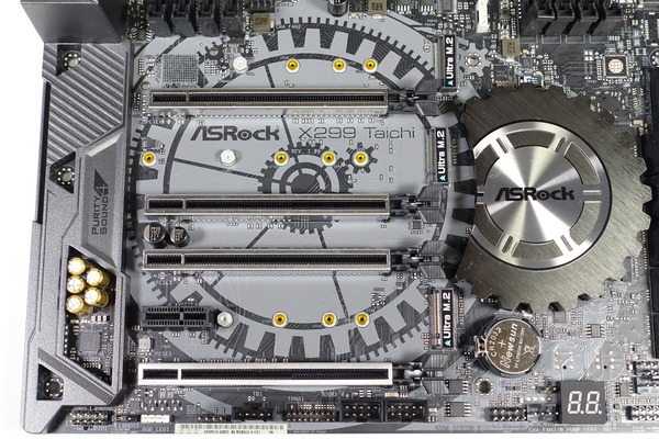 マザーボード右下のチップセット用ヒートシンクもブラック&グレーのツートンカラーになっています。ASRock Taichiといえばブラック&ホワイトのコントラストの効いたモノトーンカラーでTaichiの名前通りマザーボード全体で太極図を模したデザインが特徴でしたが、X299 Taichiではホワイトの部分がグレーになっており名前の由来でもある太極図より、その構成要素の歯車が主張するデザインになっています。太極図を模したユニークデザインも売りの1つだったはずなのでTaichiファンにとっては残念かも。