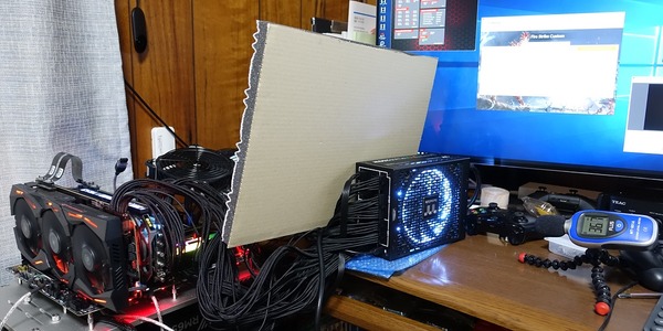 またベンチ機のCPUクーラーやグラフィックボードから出るファンノイズについては吸音材の板を使用して電源ユニット本体のファンノイズ測定への影響を下げています。非負荷時にグラフィックボードのファン回転数を負荷時の最大値に固定してもサウンドレベルメーターが35~36dBしか示さないのでこれらの影響は基本的に無視して問題ありません。