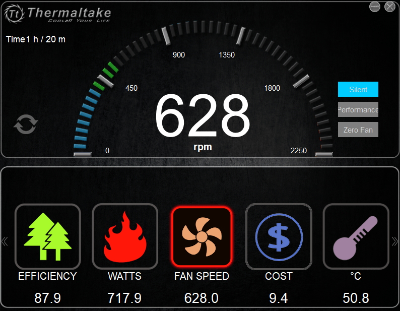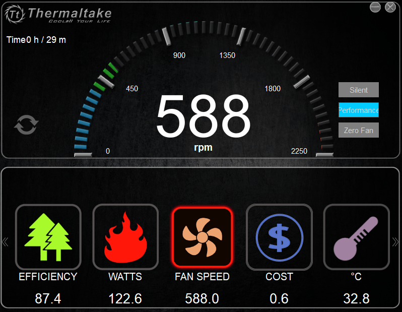 ともあれ「Thermaltake DPS G APP 2.0」をインストールして起動すると下のようなウィンドウが現れます。UIとしては単純で、中段のアイコンを選択すると上段のウィンドウに選択したアイコンに関連するモニタリングや設定操作項目が表示されます。