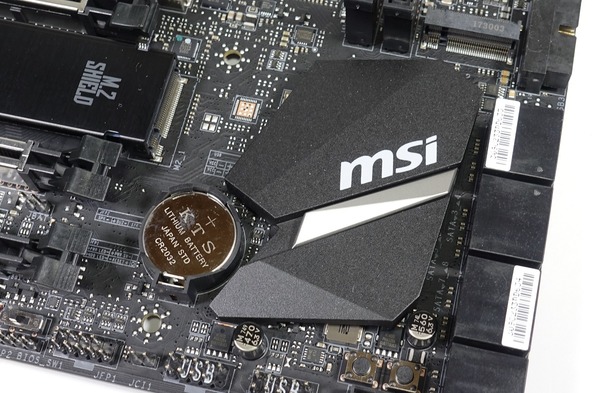 マザーボード右下のチップセット用ヒートシンクについては素材はマットなブラック塗装の金属で、中央にはシルバーラインのプレートが埋め込まれ、その上側にMSIのブランドネームが刻印されています。