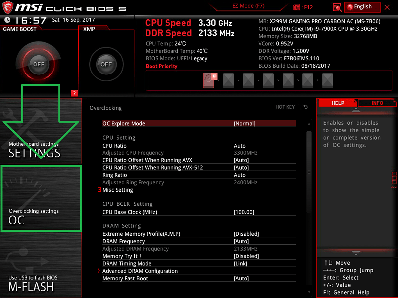 OCメニューのトップには「OC Explore Mode」という項目があり一般的なOC設定の可能な「Normal」に加えて、一部の高度なOC設定項目を解除できる「Expert」モードがあります。基本的なOC設定は「Normal」モードでも十分行えるので初心者は無理せず「Normal」モード推奨です。