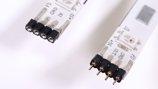 LEDテープ両側の接続端子はRGB対応汎用4PINと同じ形状ですが、[FD, GND, IN/OUT, +5V]という特殊なアサインになっておりRGB対応汎用4PINのLED機器や一部マザーボードで採用が始まっている3PIN型のアドレッサブルLEDテープとは互換性がないので注意してください。