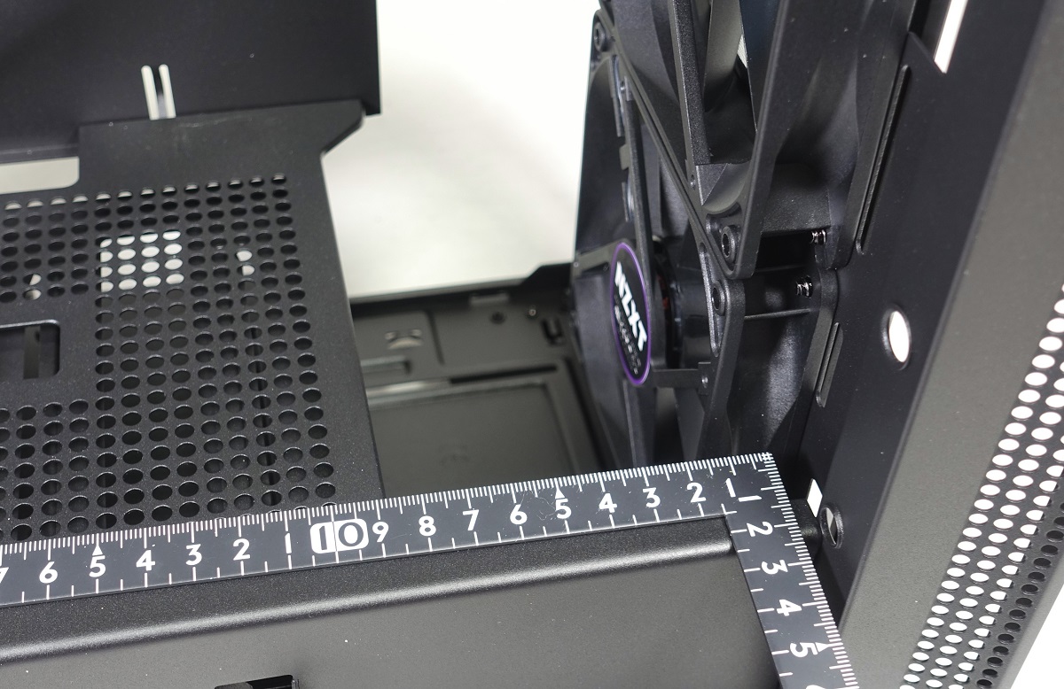 PCケースフロントのファン・ラジエーター設置スペースのサイズ・数量については上で紹介したとおり、360サイズ(120*3) or 280サイズ(140*2)ですが、厚さ方向については最大100mmのスペースが確保されています。25mmファンを使用した片面ファンであれば60mmの極厚ラジエーターも使用可能ですし、30~40mm厚の標準的な厚さのラジエーターであれば25mmファンのファンサンド構成も可能です。