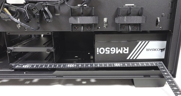 下写真は奥行160mmのCorsair RM650iを設置した様子ですが、奥行については180~200mmの1000W級電源でも対応可能な長さになっています。ただ幅については近年主流な140mm冷却ファン搭載電源ユニットを考えると幅120mm程度は確保しておいて欲しかったところです。