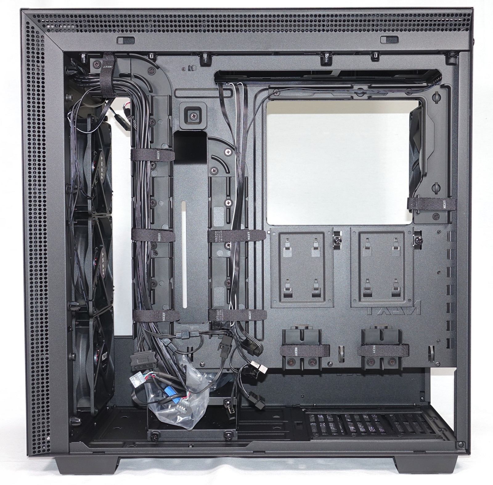 上のようにして左サイドパネルを取り外すとNZXT H700iのマザーボード裏スペースにアクセスできます。NZXT H700iの裏配線スペースの全体は次のようになっています。