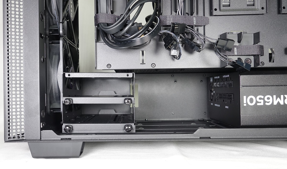 3.5インチストレージシャドウベイはPCケースフロントと電源ユニットの間で前後に配置を移動することができます。シャドウベイの位置はPCケースフロントのラジエーター設置スペースや電源ユニットおよび電源ケーブルのスペースに影響しますが、これらについては電源ユニットやラジエーターの章で詳しく説明します。