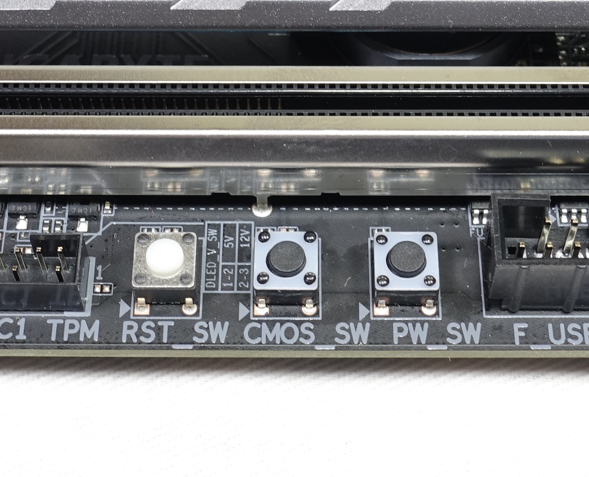 マザーボード基板右下にはPOSTエラーのチェックができるDebug LED、またマザーボード左下にはOCerのみならず一般自作erにとっても組み立て中の動作確認に便利なオンボードとスタートスイッチとリセットスイッチが実装されています。CMOSクリアのハードウェアスイッチも設置されているのでOC設定をミスっても簡単に初期化が可能なところは良いのですが、スタート・リセットスイッチと隣接しているレイアウトは誤押下の心配があるので避けて欲しいところ。