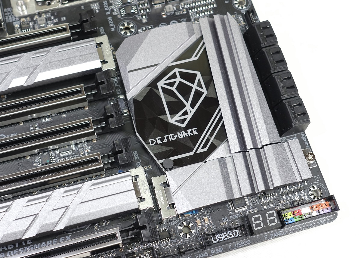マザーボード右下のチップセット用ヒートシンクについては同製品のブランドネーム「Designare」の名前とクリスタルを模したブランドロゴが描かれています。