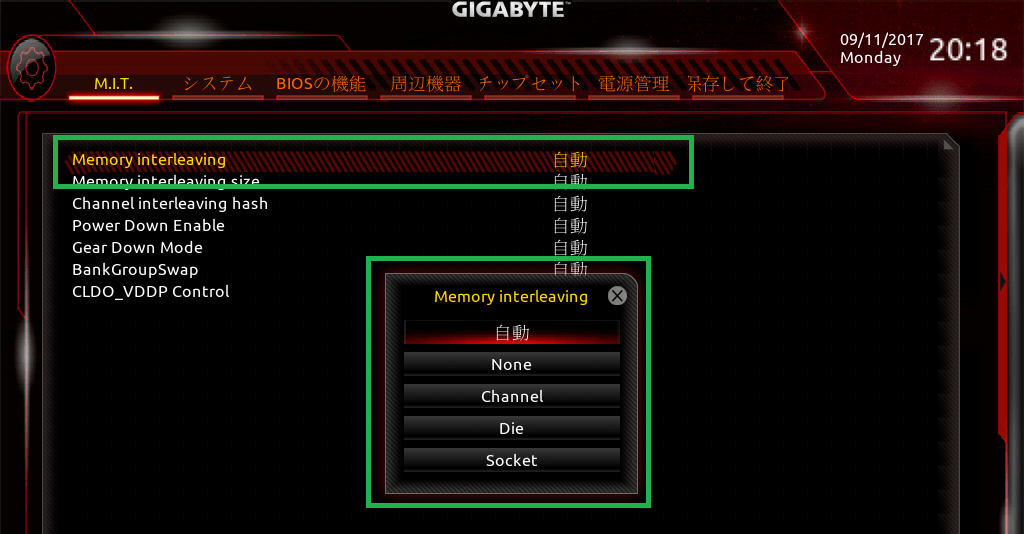 メモリ設定画面の「メモリコントローラーの設定」(もしくは「周辺機器ーAMD CBSーDF Common Options」)にある「Memory interleaving」の項目がメモリーアクセスモードの設定に該当しています。「Memory interleaving」の設定値は次のようになっています。