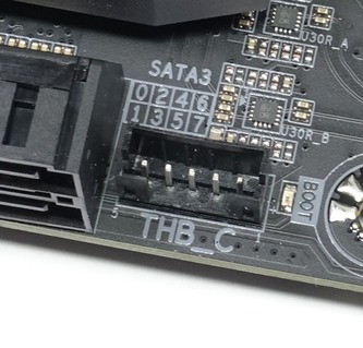 GIGABYTE X399 Designare EXにはマザーボード右端のSATA端子の上側にTHB-C端子があるので、同社のThunderbolt3拡張ボード「GIGABYTE GC-ALPINE RIDGE」(レビュー)を使用することでThunderbolt3端子を増設可能です。