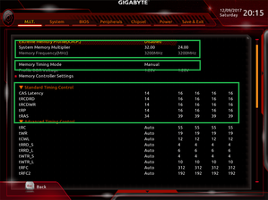 GIGABYTE X399 Designare EX(BIOS:F2b)の環境でメモリ周波数を3200MHzにOCしてメモリタイミング:14-14-14-34-CR1に詰めることができました。