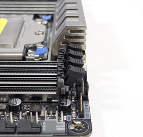 SATAストレージ用の端子はマザーボード右下に8基搭載されています。SATA3_0~7はいずれもAMD X399チップセットのコントローラーによる接続で、RAID0/1/10のハードウェアRAID構築にも対応しています。