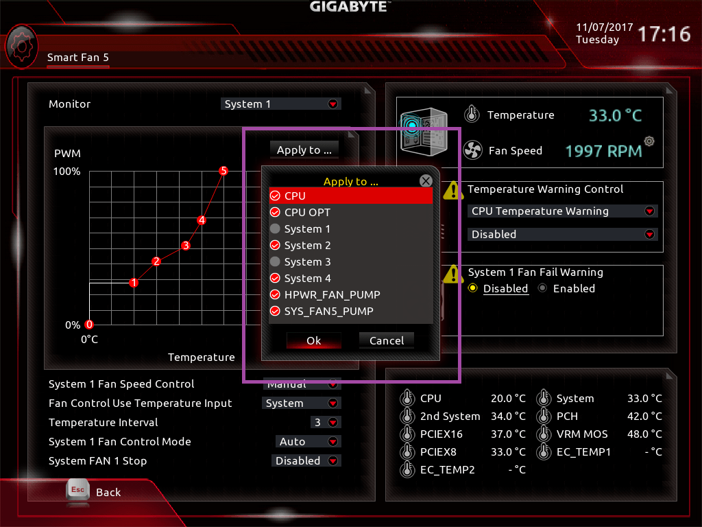 GIGABYTE社のファンコントロール機能「Smartfan 5」は外部センサーを含めた9個温度センサーをソースに8基のファンを自由自在にコントロールできるので、これを目当てにGIGABYTE製マザーボードを購入しても後悔のないほど非常に優れた機能でした。水冷ユーザーにもおすすめです。
