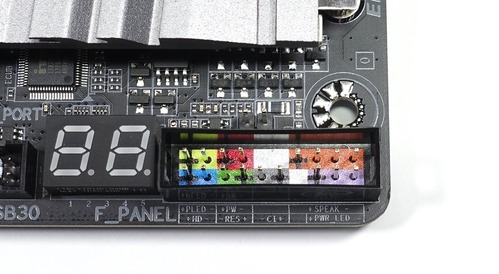 マザーボード右下にはフロントパネルI/Oヘッダーがあります。同社独自パーツの「G-Connector」が付属するのであまり重要ではありませんが、基板上に色分けされたプリントのおかげで林立している各ヘッダーピンを視認しやすく、ピンアサインは基板上にヒントもプリントされているのでユーザービリティーに優れる設計です。