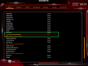 メモリ設定の「DRAMタイミングモード」を「手動」に設定することでメモリタイミングの個別打ち込み設定も可能です。メモリタイミングを手動で設定する場合は基本的には「CAS Latency (tCL)」、「RAS to CAS Read (tRCDrd)」、「RAS to CAS Write (tRCDwr)」、「RAS Precharge (tRP)」、「RAS Active Time (tRAS)」の主要な5タイミングと、加えて各種タイミングの下の方に配置されている「Command Rate:1 or 2」の6つ以外はAutoのままでいいと思います。