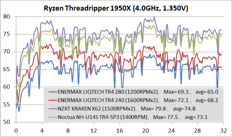 ENERMAX LIQTECH TR4 280のファン回転数を今回は1200RPMに上げましたが最大温度69.3度で、Ryzen Threadripper対応空冷「Noctua NH-U14S TR4-SP3」や280サイズ簡易水冷「NZXT KRAKEN X62」よりも低い温度をマークしています。1950Xの全コア4.0GHz OCでは消費電力も300Wを超えてくるので放熱容量だけでなくCPUヒートスプレッダと接するベースの熱交換性能のCPU温度に対する比重がかなり大きくなってきます。簡易水冷クーラーの放熱容量や熱移動のスムーズさにENERMAX LIQTECH TR4の超大型ベースプレートが組み合わさって1950Xの4.0GHz OCに対しても十分な冷却性能を実現しています。