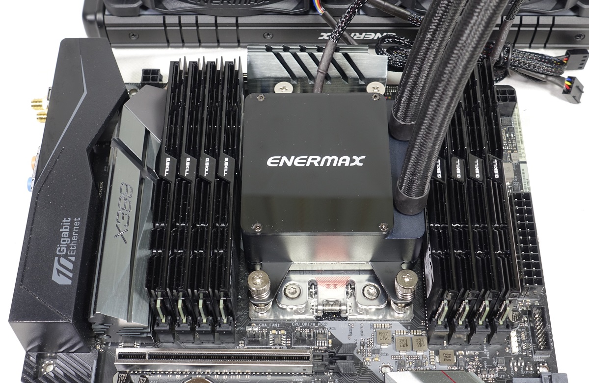 水冷チューブは見ての通り水冷トップの上面から直出しの構造になっています。CPU-メモリスロット間スペースの大きいE-ATXサイズの「ASUS ROG ZENITH EXTREME」はもちろん、ATXサイズでスペースが若干狭くなる「ASRock X399 Taichi / PG」「GIGABYTE X399 AORUS Gaming 7」「MSI X399 GAMING PRO CARBON AC」と組み合わせても問題なくメモリ8枚刺しが可能です。