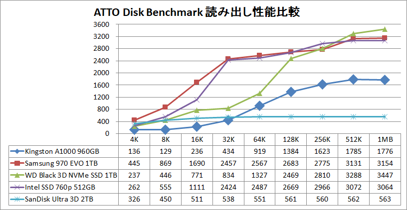 ATTO Disk Benchmarkはブロックサイズ別のシーケンシャル性能を主にチェックするベンチマークなので4KB~1MBを抜粋してリード/ライト性能をグラフにして比較しました。